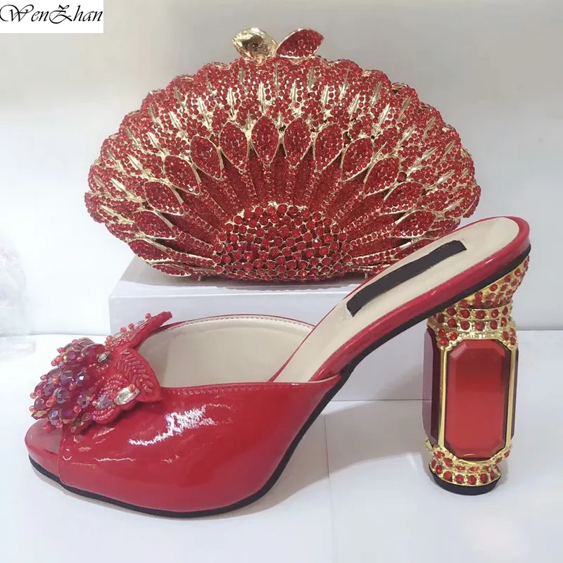 Good Price Elegant Red Crystal Pointed Toe Wedding Shoes With Crystal Clutch Bag High Quality High Heels Sanda